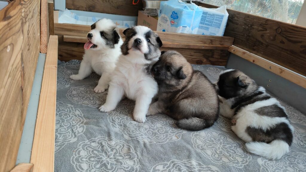 VIER SCHWARZE GROSSSPITZE UND EIN WOLFSSPITZ RUHEN SICH AUS, SIND JEDOCH IMMER WACHSAM.